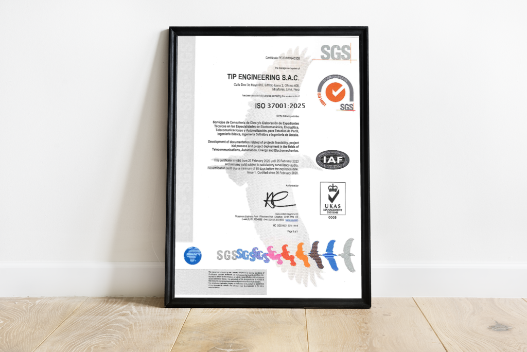 En Tip Engineering S.A.C. brindamos servicios de consultoría en Ingeniería e Implementación de su infraestructura, que satisfacen ampliamente los requisitos y las expectativas de los involucrados en nuestros diferentes servicios, así como las normas aplicables; a tal efecto, Tip Engineering S.A.C. ha implementado y Certificado un Sistema de Gestión documentado e Integrado, alineado al cumplimiento de las Normas ISO 9001 Calidad, ISO 14001 Medio Ambiente, ISO 45001 Seguridad y Salud Ocupacional e ISO 37001 Gestión Antisoborno.